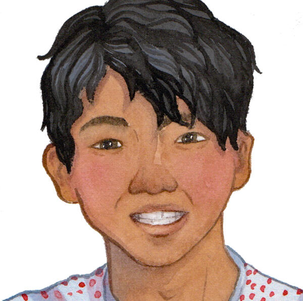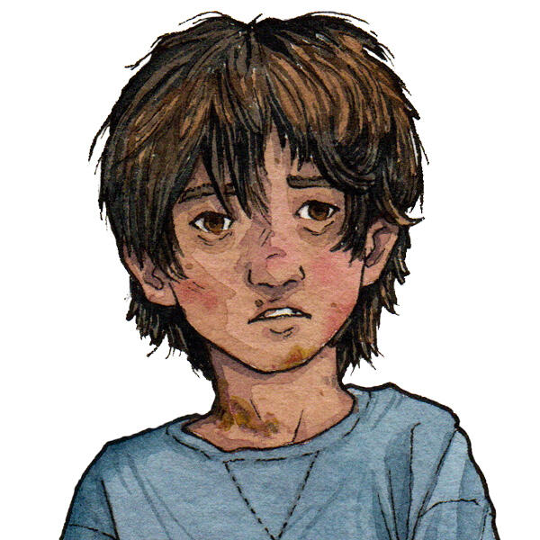 round face, lots of graphic tees of games/shows he likes, a little fat but loses a lot of weight after moving in with nico